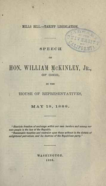 William McKinley served as a member of the U.S. House of Representatives from Ohio from 1877-1884 and 1885-1891. On May 18, 1888 McKinley made a speech in Congress opposing the Mills Bill (1888) proposal sponsored by the Democrats to significantly reduce tariff rates (by up to 50%). It was sold to the public as a benefit to consumers and would lower the cost of living. Grover Cleveland was president at the time (1885-1889).