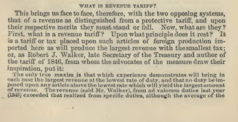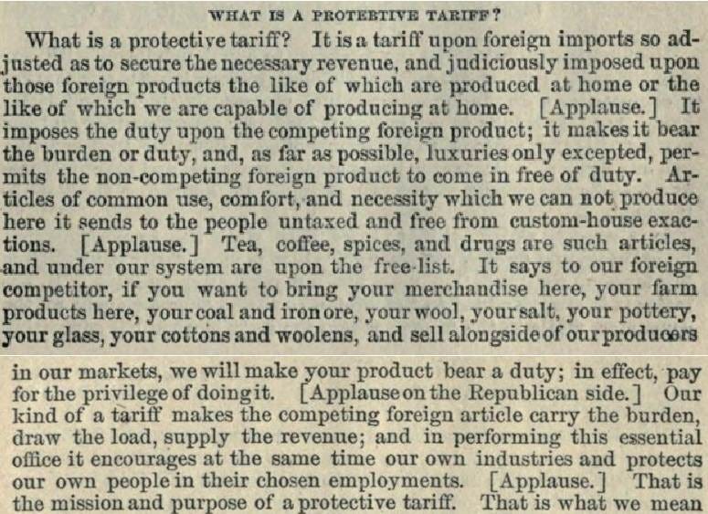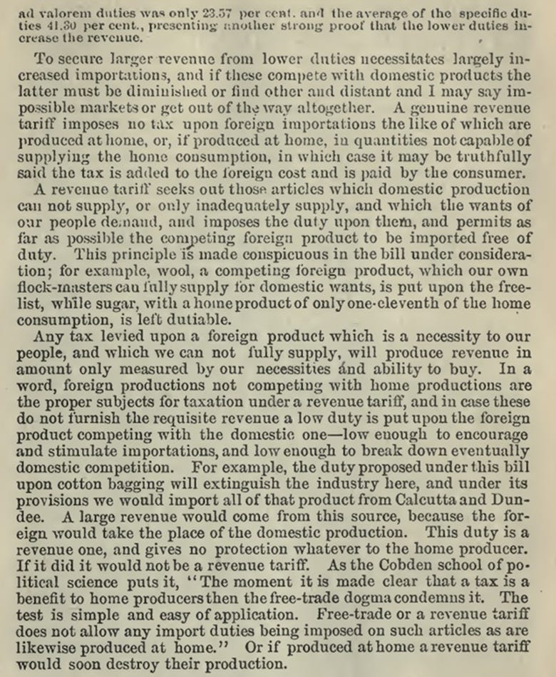 In this speech McKinley goes over the difference between a revenue tariff (what was being proposed by the Democrats at the time via the Mills Bill) and a protective tariff (from the American System school): McKinley defines what a revenue tariff is, which is “a tariff or tax placed upon such articles of foreign production here as will produce the largest revenue with the smallest tax.” In order to achieve this McKinley explains, you need to largely increase the amount you are importing. Such that the more you import, with the smallest tax or duty, the larger the revenue you can generate off of this tax. For example, if you tax 10 cents per can of Coca Cola, the higher the number of cans you import, the more revenue you will make. As we should be able to appreciate already from this series, that is the very opposite of what you want to accomplish if you want your manufacturing home base and industries to grow. You want to use your domestic consumer base to support your own economy by buying the goods you can already produce at home and to increase investment in your manufacturing capabilities such that your consumer base is supporting the economic foundation of the nation. This way there is more wealth to invest in the people’s standard of living and goods ultimately become more affordable and of a higher quality (i.e. the more streamlined things become the higher the efficiency and the lower the cost). McKinley makes the point that a revenue tariff does not differentiate between a good that is made at home vs abroad which is made clear in the Mills Bill Tariff proposal he is criticizing. He gives the example (from the Mills Bill itself) of wool, which the Americans can produce enough at home to meet their needs. However, wool is a product that is not being tariffed (under the proposed Mills Bill) as an imported good despite great competition from foreign markets, whereas sugar is tariffed when Americans can only produce one-eleventh of their needs. Thus, with this sort of tariff application, the consumer is actually paying more. By tariffing goods, like sugar, that cannot be produced sufficiently at home the consumer has nowhere to buy the product except as an import. It is effectively a tax, NOT a real protective tariff to boost domestic growth. Meanwhile such lack of differentiating products made at home vs abroad will work to destroy domestic industries such as the wool industry. Thus, it should be clear here, that not all tariffs work as protective tariffs, and are not necessarily going to be beneficial to the domestic economy. Simply invoking the word “tariff” is not some sort of magical formula that will save American industry without looking into the details of how it is in fact being applied. McKinley ends with “A large revenue would come from this source [foreign], because the foreign would take place of the domestic production. This duty [tax] is a revenue one, and gives no protection whatever to the home producer…if produced at home a revenue tariff would soon destroy their production.” Thus, McKinley makes it quite clear, a revenue tariff has the same outcome as that of free trade, which is to destroy home production. The revenue generated is really going into a small number of pockets while domestic industry and the consumer base pay the real heavy cost of a revenue tariff. Unfortunately, despite President Trump trumpeting his desire to revive McKinley style protective tariffs, his “tariff everything” approach to American “protectionism” is in fact doing the very opposite and is using a revenue tariff application rather than that of a true protective tariff as the actual words of McKinley himself testify to. It is like saying you are making big bucks for America by taxing home producers and consumers, it is counter-productive for growth and lowering cost of living. Suffice to say, that a revenue tariff will always work at the cost of domestic production and the consumer base. It also showcases that despite US Secretary of Treasury Scott Bessent repeating ad nauseam that the American people are not being taxed, and will not be paying higher prices with the “tariff everything” approach, McKinley has made it crystal clear, that a revenue tariff is in fact a tax, and yes, the consumer will be paying more. McKinley continues in his speech to Congress in 1888 to define what is a proper protective tariff (as opposed to the Mills Bill revenue tariff): Thus, McKinley specifies that a protective tariff only places a duty on foreign imports that compete with domestic products. Except for luxury goods, essential foreign imports that are non-competing with a domestic product, go tariff free, so that the domestic consumer may have access to such goods, such as coffee, tea, spices, and drugs without being charged a duty. McKinley states “Articles of common use, comfort, and necessity which we can not produce here it sends to the people untaxed and free from custom-house-exactions.” McKinley goes on to state on what is a protective tariff: