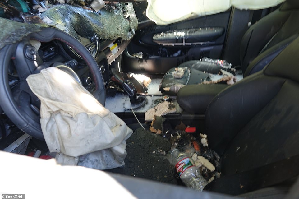 An interior shot shows the Mini Clubman's airbag had blown out along with most of the decor being burnt through following the crash
