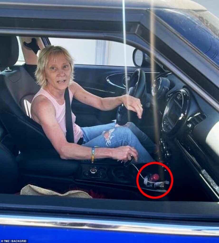 A photo from earlier on Friday shows Heche moments before the second accident at the wheel with a bottle of vodka with a red cap in the cup holder