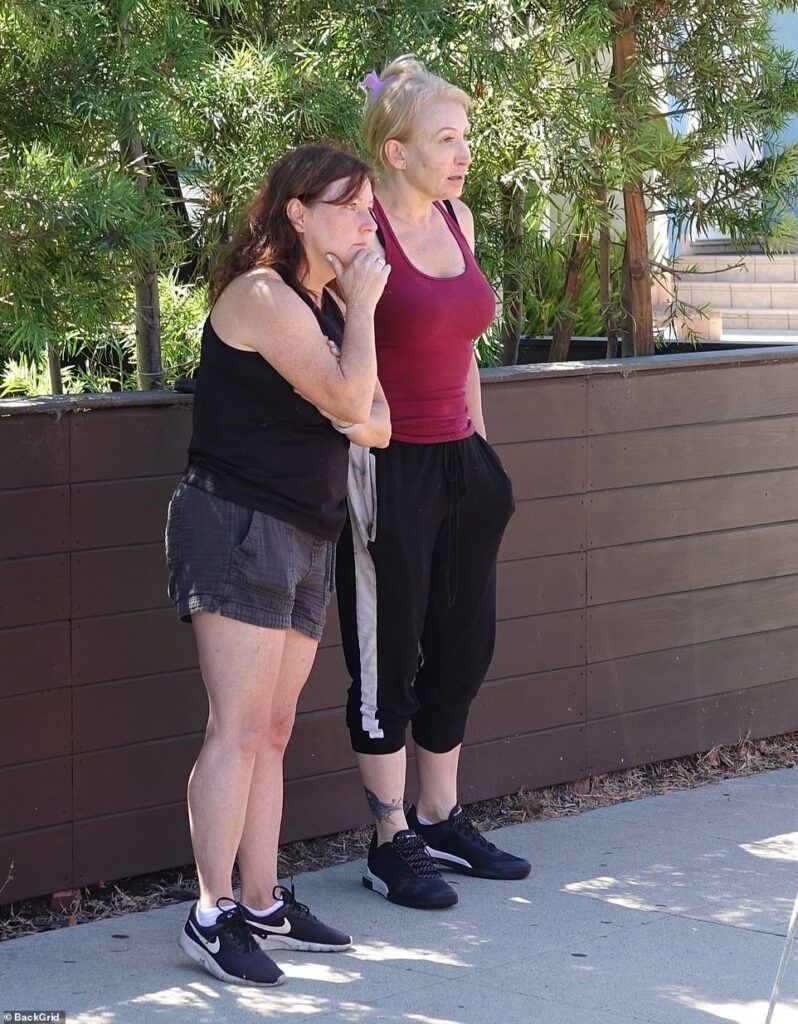 Homeowner Lynne Mishele, seen in the maroon, stands across the street from her home looking dazed and confused after actress Anne Heche slammed a Mini into the side of her house and triggered a large fire