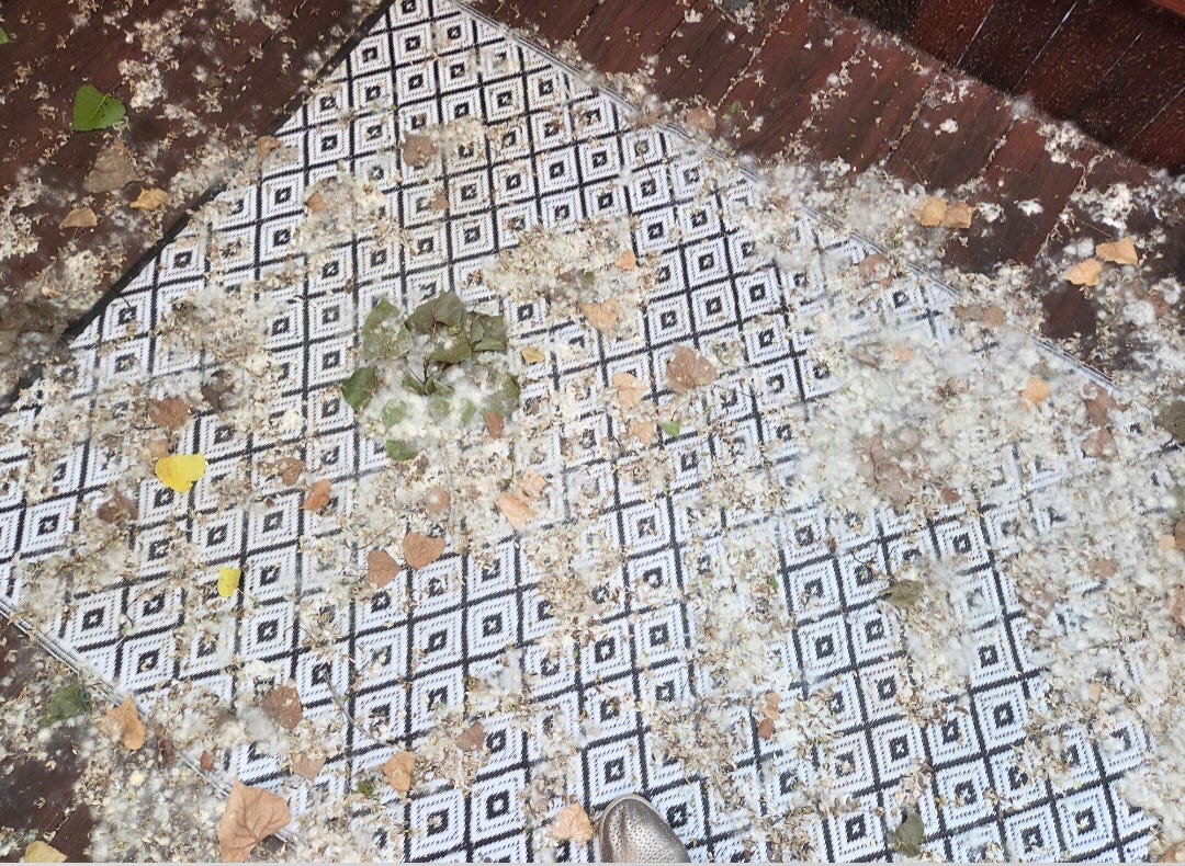 It finally stopped. The blizzard of cottony white seed pods harboring their sticky goo—a ceaseless stream of puffy parachutes packed with life going on. The constant shower of fluff fell from the clear blue sky like winter’s perpetual snowstorm, but it was June in Dallas, Texas, and this was summer’s unfurling blanket. From a mighty cottonwood. Venerable and enormous, yet fragile and overgrown from years of neglect, she stood in quiet reserve most of the year, looming over my modest mid-century condo until she exploded like an overstuffed down comforter for about six weeks each summer. As one of the most substantial trees I have ever seen, much less cohabitated with, she was about eight stories tall and five feet in diameter, rooted just a couple of feet from my front porch. I have lived here for almost three years, and this was the densest cascade yet. The festoon of fuzzy flotsam found its way into every orifice—exposed and not. Every door, window, vent, nostril, ear canal, lip, eyelid, and yes, there, too. Whenever I stepped outside, my eyes teared up as the mischievous micro-stems caught in my throat with each new breath. It was like inhaling cigarette smoke that was actually Elmer’s glue. You couldn’t wave it away. You couldn’t sweep it away because the power puffs morphed and spontaneously combusted when touched. They adhered instantly to anything and formed patches of pasty oatmeal pancakes on every surface, like my deck, fence, and air conditioning units. Last year, after spending $750 on new capacitors, I purchased fancy mesh covers from Amazon.com to prevent the fervent penetration. The tailored covers reminded me of something June Cleaver might have used to cover her toaster. It was just hard to imagine how an air conditioner can function in the Texas heat while wearing a jacket. Every morning and evening during these six weeks, I went out and brushed off the fluff that collected on all sides of the covers. This was a task I never imagined would be part of my life. To use another mixed mid-century metaphor, I felt like Lucy Ricardo trapped in the Twilight Zone. It’s the lesser of two evils, I suppose, especially since the only semi-attractive plant in my HOA-maintained yard was a ragged rose bush that pierced my leg through my clothes every time I leaned in to perform my de-fluffing tasks. The irony was hard to ignore. I wondered why I was the only one in my community engulfed in this insistent cloud of ostensibly insubstantial froth. “Location. Location. Location,” they said. “On the corner,” they said. And luck, of course. “You are a product of your choices,” they also say. But also, sometimes, things just don’t work out well. Some things actually suck. That is how it is. Or maybe it’s my mischievous mother trying to insert herself through the sprinkles of uncomfortable presence. She loved the word fluffy. Sadly, this towering wooden matriarch in her seventies had far exceeded her lifespan as a cottonwood, barely hanging on in this urban location. My HOA had cut down many of our ailing trees but had avoided the three largest and most dangerous ones due to the expense. Now, that makes sense. Two of those were closest to me and had been aptly named “Thelma and Louise” by the community. But they should be Thelma and Larry, as mine was female, and the one down the sidewalk was male. I’m not surprised my overwhelmed nervous system recognized Thelma’s deeply embedded trauma at first sight. What attracted me to this location now repulsed me. A familiar refrain. It’s so bitterly sweet, as I adore trees. In fact, like Mary Oliver, I think trees have “saved me, and daily.” I wish I did not feel so frustrated about Thelma. It’s not her fault. Since losing my son Elliot and the rest of my immediate family, except my dear Ian, nature has been my most potent tonic. My reliable refuge. “In the untainted forest, cottonwoods can live for 150 years or so,” said burly Rick, the handsome and tanned arborist from Southern Botanical, as he assessed Thelma. I called him for a professional consultation out of desperation after my alleged HOA management company ignored my requests. Another tree in my yard had been so mangled in a terrible storm that the precarious limbs were continuing to crack and tumble whenever the wind gusted above 40 mph. I needed lots of tree therapy. “This should come down immediately,” dashing arborist-Rick said with certainty. “These trees have been neglected for decades. Look how the ends of their branches are dry and brittle, weighed down by overgrowth, and the trunk is infested with fungus and rot.” He also confirmed that the volume of white tufts was likely related to distress. “There is an injection we can administer at the roots that will significantly reduce the volume and duration of the fluff release,” he said. I submitted this data to the HOA board, but the hostile, self-righteous president scolded me for consulting an outside vendor like he was a high school principal—even though I was just gathering information because the HOA had not responded to my requests. “We will never pay an outside vendor you choose,” he barked in an instant message. “We gave you an answer about your tree. You just didn’t like it. We don’t have a ‘save any tree at any cost’ policy here. That’s it.” Grrr. It’s a rock and hard place. Customer service is clearly not the priority here. The HOA is legally responsible for the maintenance of the common area and “walls-out” of every unit, for which we pay healthy monthly dues. I’m so frustrated, and I detest wasting my precious energy on these petty conflicts. I own a home but have no authority over how it is maintained. I so want to cultivate a content life. Not even a fabulous one, content will do. No more HOAs to start. I am getting an Airstream next time. I always look for the lesson, and I think this one is as old as time: You can’t go home again, 